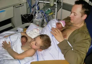 Une photo attendrissante montre le grand frère aidant son père à offrir une thérapie peau à peau à des jumeaux prématurés, un geste qui pourrait littéralement leur sauver la vie
